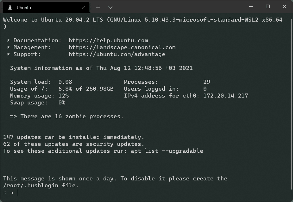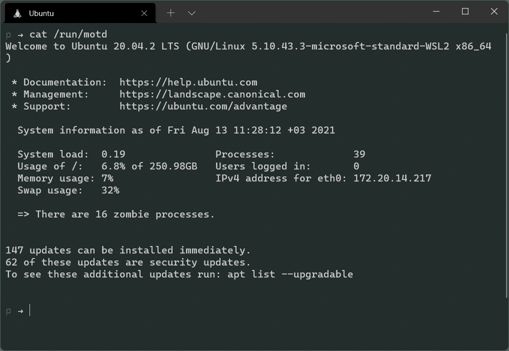 Execute the following command on a Terminal window to display the content of /run/motd;
